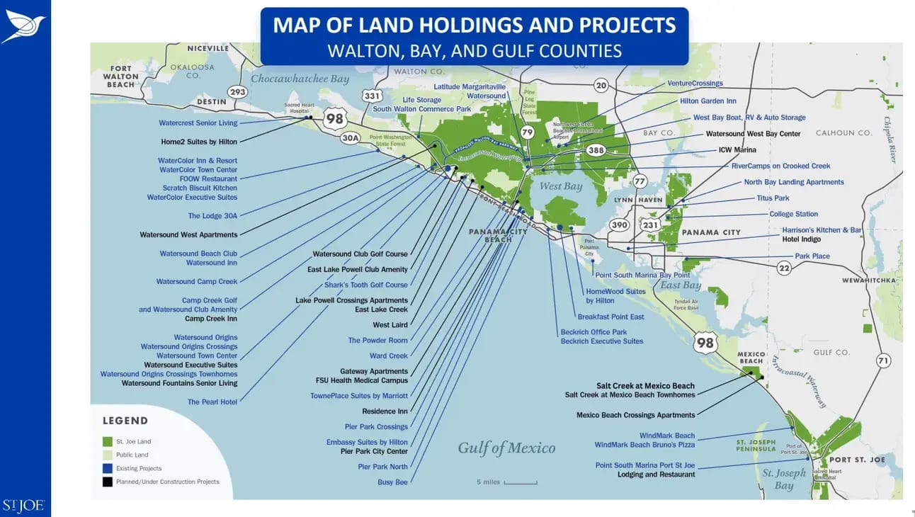 The map above depicts St. Joeâs current land holdings in dark green, completed commercial properties in blue and planned developments in black. Although, some of the projects in black are already complete. Before we discuss what St. Joe is today and where itâs headed, letâs first understand its historyâŚ